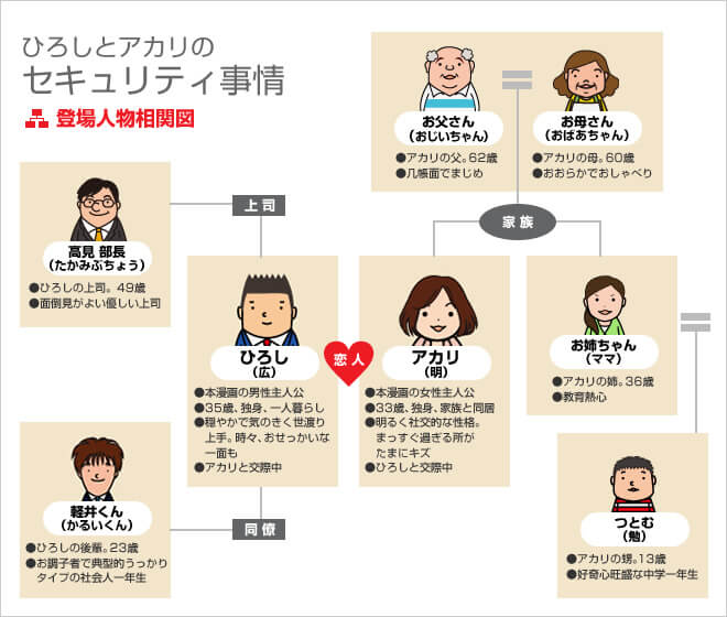 世渡り上手のひろしと明るくおっちょこちょいなアカリ、その周囲の人のインターネットセキュリティにまつわる日常をお届けします。