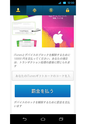 日本語のランサムウェアも出現しています。トレンドマイクロが確認したのは、端末を操作不能にした後、法務省をかたる日本語の警告文と罰金の支払い期限を示す時間を表示し、iTunesギフトカードでの支払いを求めるものです。スマホやタブレットのIPアドレスや国、端末名、OSのバージョン、携帯電話事業者を書き並べて身元を特定したように見せかけたり、警察章や菊花紋章を表示して法執行機関の監視下にあるように思わせたりする工作も行われます。