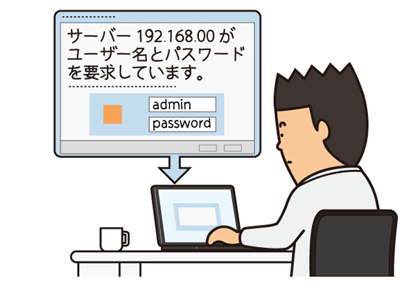 ルータの管理画面にアクセスするための IDとパスワードは、製造元や機種ごとに工場出荷時の設定値が一律で決まっていることがあり、取扱説明書や製造元のホームページに公開されていることもあります。もし、そのようなルータへの第三者によるアクセスを許すと、デフォルトのIDとパスワードで管理画面に入られ、不正に設定を書き換えられてしまうかもしれません。ルータの管理画面にアクセスし、第三者に推測されにくいIDとパスワードに変更しましょう。