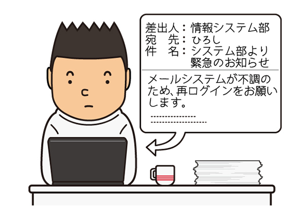 勤務先のシステム部門やその担当者から業務用のメールサービスへの再ログインや、アカウント情報の提供を求めるメールが届いたら警戒してください。それは、業務メールサービスのアカウント情報をだまし取るためにサイバー犯罪者が送りつけてきたフィッシングメールかもしれません。もし、偽装メールの依頼に応じてしまった場合、業務メールアカウントに不正アクセスされ、メールの内容を盗み見られたり、スパムメール拡散の踏み台にされたりする可能性があります。そのようなメールが届いた場合、返信することは避けてください。メールに記載された問い合わせ先ではなく、普段使用しているメールアドレスや電話番号に連絡するか、社内専用のコミュニケーションツールなどで事実確認をしましょう。